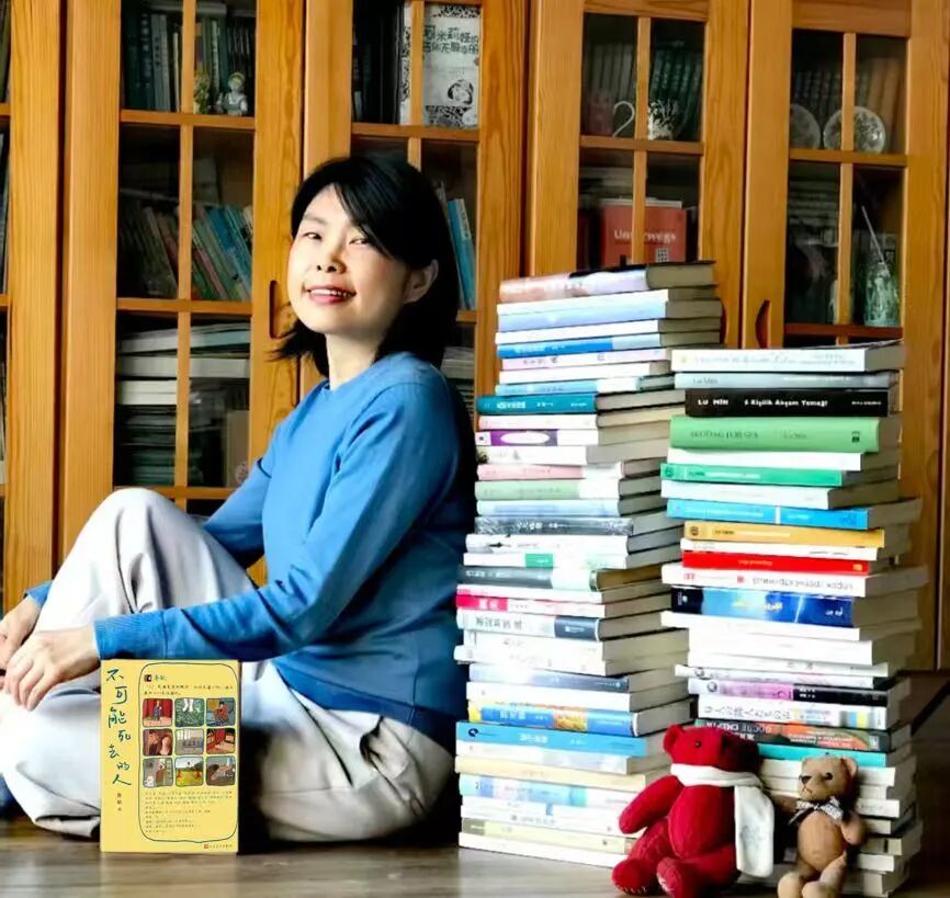 书店一角静静躺着一只硕大的毛绒玩具熊,闲聊中,鲁敏突然一路小跑,把熊抱到沙发上,要和它合影。搂着毛茸茸的胳膊,眼睛笑成了两道弯……