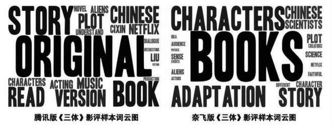 转向代表更广泛国际观众声音的IMDb平台,对两部剧最高点赞的25条影评高频关键词词云图(图3)进行分析,可以进一步揭示其关注点差异。腾讯版影评聚焦“original”“book”“read”“plot”等关键词,强调剧集对原著的严谨复现,以及观众对剧集节奏和发展的高度关注。关键词中,中国元素的频繁出现则显示了观众对中华文化的浓厚兴趣。相比之下,奈飞版则高频出现“character/characters”“adaptation”“science/scientist”等词汇,反映国际观众对其角色塑造、科学元素呈现与独立剧集质量的关注。总体来看,两个版本影评都普遍将剧集与原著进行对比,但在剧情节奏、文化背景呈现以及科学元素和国际化视角上存在差异。这些异同揭示了海外观众对两个版本的不同需求与接受度,也展现了科幻影视跨文化传播的复杂性与潜力。