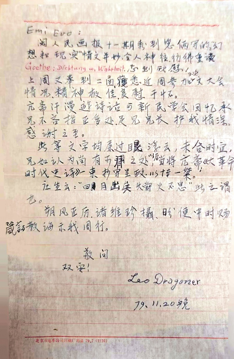 阅人民画报十一期看到您俩写的:“幻想和现实”情文并妙,令人神往,仿佛重读Goethe:Dichtung und Wahrheit*,感到欣慰!