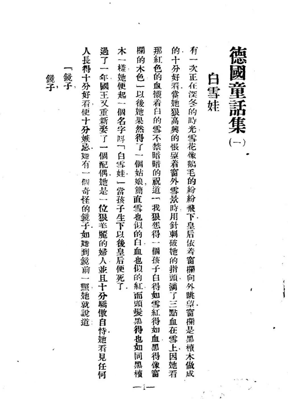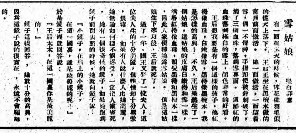 《时谐》专栏连载完后又曾单独结集(商务印书馆,1914年),足见在当时很受读者青睐。不过这种译笔所预设的读者,绝不会是略识之无的幼童。有出版者对此就颇不以为然,直言“这是儿童很大的不幸”(《上海开明书店出版新书·德国民间故事集》,载《文学周报》第六卷,1928年)。然而此事又谈何容易,在文言译本问世多年以后,更适合儿童阅读的白话译本,如王少明译《雪姑娘》(收入《格尔木童话集》,河南教育厅编译处,1925年),高君箴译《魔镜》(收入郑振铎、高君箴合译《天鹅》,商务印书馆,1925年),坚白译《雪姑娘》(载1926年第44期《晨报副刊·家庭》),刘海蓬、杨钟健合译《白雪娃》(收入《德国童话集》,古城书社,1928年),康元白译《古怪的镜子》(收入《新时代小学生丛书·童话》中册,广益书局,1933年),魏以新译《雪白儿》(收入《格林童话全集》,商务印书馆,1934年)、谢颂义译《白雪公主》(收入谢颂羔编《格列姆童话选》,广学会,1939年)、林俊千译《白雪公主》(收入《格林姆童话》,鸿文书局,1941年)、张亦朋译《白雪公主》(收入《格林童话全集》,启明书局,1949年)、丰华瞻译《白雪公主》(收入《格林姆童话全集》之四《白雪公主》,文化生活出版社,1952年)等才陆续问世。有些译本在介绍原作者时,或称“格尔木”,或作“格林姆”,或云“格列姆”,与日后相沿成习的译名“格林”均有出入,而另一些译本干脆将原著情况略过不提,好在覆按主要故事情节,应该都本自格林版童话。