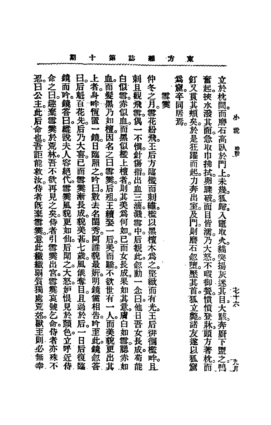 在《东方杂志》上刊出《雪霙》后,还有一篇由崔弇、雁秋用浅近文言合译的《白雪公主与七矮人》(载《妇女时报》第十九号,1916年)。文中讲述公主降生时“肌肤润泽,其形不亚于祥霙”,显然受到过《雪霙》的直接影响。译作在标题下注明系“德国文学大家克林著”,照理应该也源于格林童话。然而仔细读罢,却令人疑窦丛生。全篇的主要线索固然与格林版相仿,却凭空交织了许多荒诞离奇的情节,不知道是这两位译者确有所本,抑或一时兴起而自出手眼。