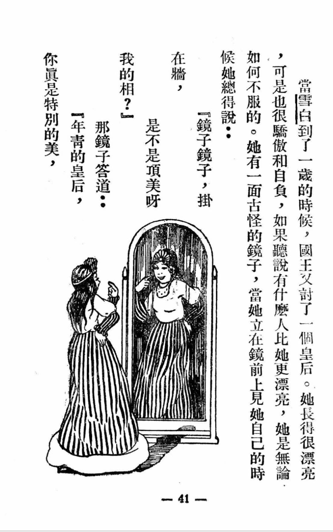 不过在叙事技巧方面,这篇作品倒是有些值得留意的地方。比如叙事者借鉴传统小说笔法,常会以说书人的身份出场。开篇提到“蓦见一艳若桃李、冷若冰霜之少妇,倚窗而坐,从事针黹”,随即补充道,“伊何人!伊何人!即吾书所述之白雪公主乎?曰:非也,乃皇后秀玉。白雪,其所出也”。后文述及公主误食老妇送来的毒苹果,又马上交待道,“读吾书者,抑知此时之老妇为何如人乎?余以极简单语以告之曰:老妇非他,即舒后也”。当矮人们将公主放入玻璃棺时,又立刻提示,“嗟乎,白雪果死耶?曰:犹未也”。这样既能消除与读者间的隔阂,又能随时补充情节,梳理线索。作品在叙事时还擅长埋设伏笔,用以制造悬念。公主被抛弃在密林中,醒来后自伤孤苦无依,准备就此追随亡母而去,可是扪心自问,“侬有父王及惠司吞君在,又何忍舍斯以去”,便立刻打消了轻生的念头。不过小说并未立即挑明这位“惠司吞君”的身份,直到后文讲到小矮人们安排公主诈死才揭晓谜底——“白雪之生母有堂姪曰惠司吞”,与公主“相处颇善,两小无猜,无形中爱蒂情根,已牢牢种就”,先前的积疑才算有了答案。这类笔法在儿童文学中比较稀见,可见作品在谋篇布局时确实煞费苦心。