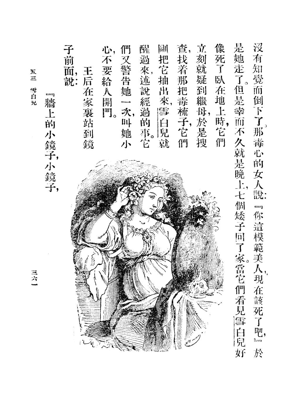 格林童话里公主的生母只是一笔带过的小龙套,本篇却用大量笔墨详述其家世背景和生平遭际。称其本名秀玉,出身商人家庭,“甫四岁,即知从母以习针黹。七岁,父延师教之读,过目不遗”。长大后她格外热衷于创作,“就中以小说及诗稿为最多,惟俱隐名刊布,故世人传诵,但叹服其著者之文笔高雅,理想奇特,深以未识其真面为憾也”。其后家道中落,秀玉随父母屏居乡里,“将托笔墨生涯,以补家需所不足”。某日偶遇微服出游的国王,两人一见如故,相谈甚欢。国王无意间发现“往昔寤寐思服之大文豪,即此玉立亭亭之女郎”,倾慕之意顿生。此后他或“书札往来”,或“亲访佳人”,终于如愿以偿,“易朋友之乐,为伉俪之欢”。格林童话里继母首先派遣猎人去杀害白雪公主,在本篇中也平添波折,称国王续娶的王后舒氏谎称“京城疫症大行”,佯装担忧“雪儿体素弱,更宜防于未然”,建议国王将公主“匿宫后净屋中,不越雷池一步”。这样既疏离了父女的关系,又消除了公主的戒心。接着她又诡称公主猝发恶疾,“病属心经,毒遍五内,脉象颇危”,实则下药将其迷晕,令人将其弃于密林之中。诸如此类节外生枝的插曲层出不穷,读来令人咋舌不已。