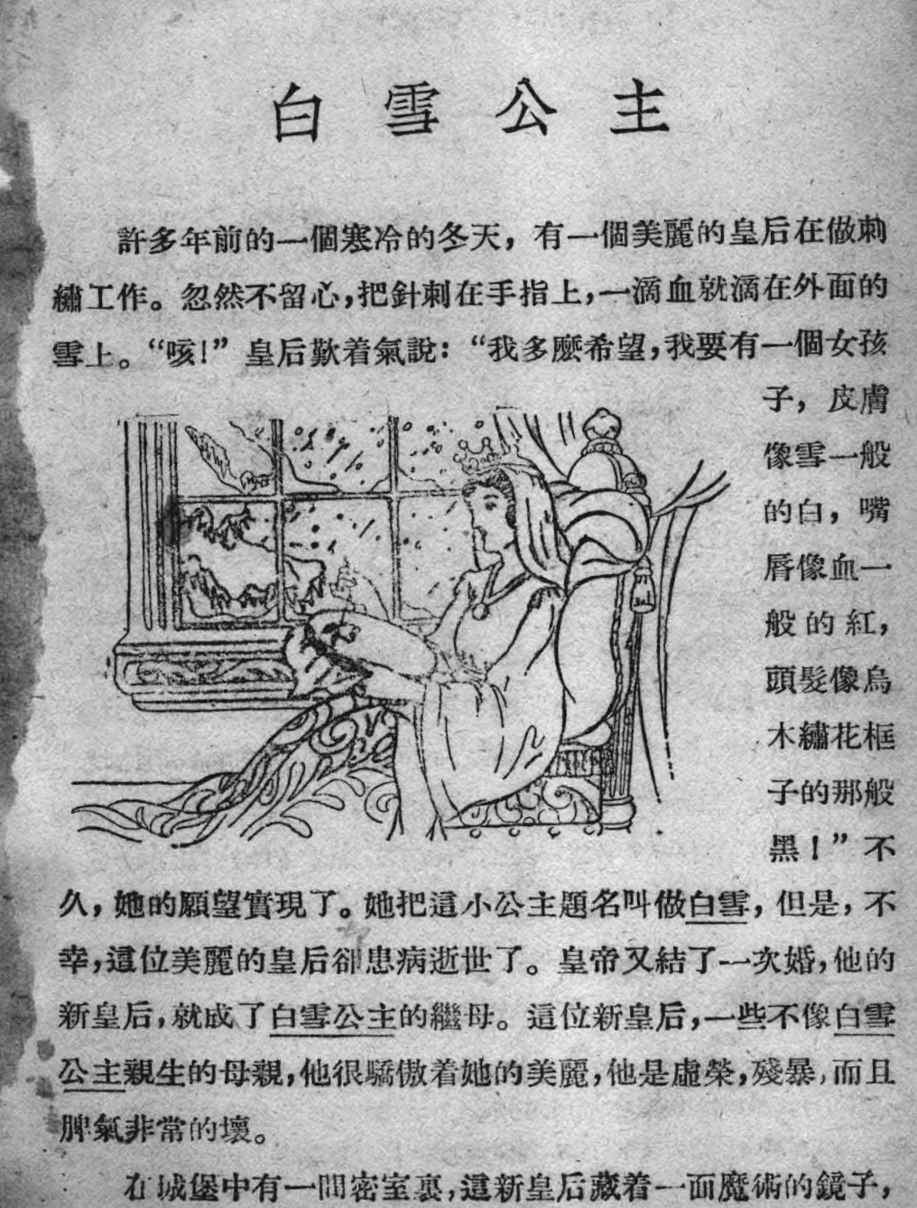 美国迪士尼公司在1937年斥巨资拍摄了电影史上第一部有声彩色动画长片《白雪公主》(Snow White and the Seven Dwarfs),上映不久便引发了各地的观影热潮,“在世界上取得了巨大成功,并为以后所有的动画长片定下了一道高不可及的标准线”(史蒂芬·卡瓦利耶《世界动画史·1928-1957:动画电影的黄金时代》,陈功译,中央编译出版社,2012年)。影片随即被引入中国,同样备受好评。日后致力于儿童文学翻译及创作的任溶溶,到了晚年对此依然津津乐道:“我小时候喜欢看迪士尼的动画片,直到后来动画片发展拍出来的《白雪公主》和《幻想曲》。”(《说说好莱坞老电影》,载2016年2月26日《新民晚报》)足见印象之深刻。为了满足不同观众的偏好,在粤语地区还将片名另译为《雪姑七友传》,有人甚至惊呼它是电影艺术“转进到另一个重要的阶段的象征代表作”(赤《〈雪姑七友传〉里那些角色原来都“真有其人”》,载1938年10月27日《大公报(香港)》)。当时就有影评指出,这部电影的情节“是根据格列姆氏童话集中的故事而来的”(《关于白雪公主影片》,载1939年6月《明灯道声合刊》)。而仔细爬梳这个童话故事在中国的译介始末后不难发现,人们实际上早就已经通过各种途径,了解到这位甜美可爱的公主所遭遇的曲折坎坷。