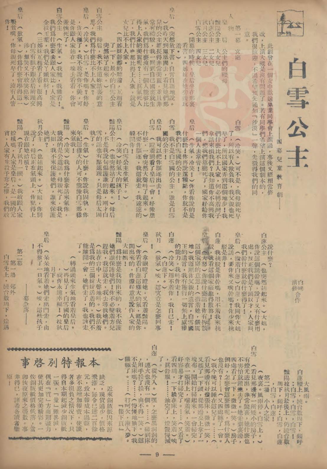 有的作品彻底颠覆了童话原作的主题。白鸥、清修合作的儿童剧《白雪公主》(载《沙漠画报》第三卷第二十五期,1940年),为白雪公主又添上了三位姐姐——艳阳公主、白莲公主和秋月公主。她们的继母发现邻国公主既容貌姣好又知书达理,忍不住埋怨:“我们什么都比得上人家,就是女儿比不上人家。”没想到激起公主们的逆反心理,最年幼的白雪公主甚至出言不逊:“我知道你不高兴我们,把我们熬腾死了,国家好给你一个人掌管!”四姐妹一气之下结伴出走,误入小矮人的家中。待了解事情原委后,矮人们好言规劝:“一个家庭要互相亲爱才可以兴旺,一个国家必要互相团结才可以强盛!”公主们反躬自省,后悔不已,在矮人们的护送下返回宫中。最终母女冰释前嫌,大家手拉手“圈成一个大圈子,绕着皇后跳着唱起歌来”。这部剧作在标题下注明“四幕儿童教育剧”,为了发挥寓教于乐的引导功用,就将原作所呈现的继母与继女之间的激烈冲突,改成了相互理解和彼此体谅。两位作者在开篇小引中自称,“此剧曾在一个女中欢送毕业同学会上演过,事后又经相当修改”,还欢迎其他读者继续“上演这个剧本”,看来还很受欢迎。