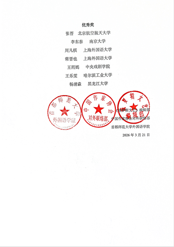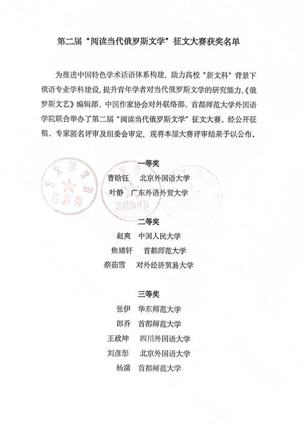 为推进中国特色学术话语体系构建,助力高校“新文科”背景下俄语专业学科建设,提升青年学者对当代俄罗斯文学的研究能力,《俄罗斯文艺》编辑部、中国作家协会对外联络部、首都师范大学外国语学院将举办第二届“阅读当代俄罗斯文学”征文大赛。经公开征稿、专家匿名评审及组委会审定,现将本届大赛评审结果予以公布。