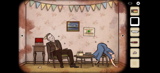 在《逃离方块:生日》(Cube Escape: Birthday)中,玩家被直接放置在一间封闭的房间:这是一次家庭生日聚会的现场。游戏没有提供任何背景说明或任务指引,玩家能够做的,只有通过点击房间中的物件进行尝试,在交互中完成一系列看似温馨的生日活动。随着留声机转动,诡异的音符在房间内游荡,门铃的突兀响起,玩家目睹父亲阿尔伯特·范德布姆被闯入者枪杀。枪声尖锐,鲜血在地板上缓缓晕开。在这场解谜仪式中,死亡成了一场被无限延宕的“语法实验”。当角色的生命体征在屏幕中熄灭,故事并未随之结束,叙事时间反而进入一种停滞状态——死亡的终局性被悬置,玩家必须,也只能继续行动:检查尸体、搜寻房间、拾捡道具、破解谜题,甚至尝试用某种超现实的方式挽回或回应这场死亡。