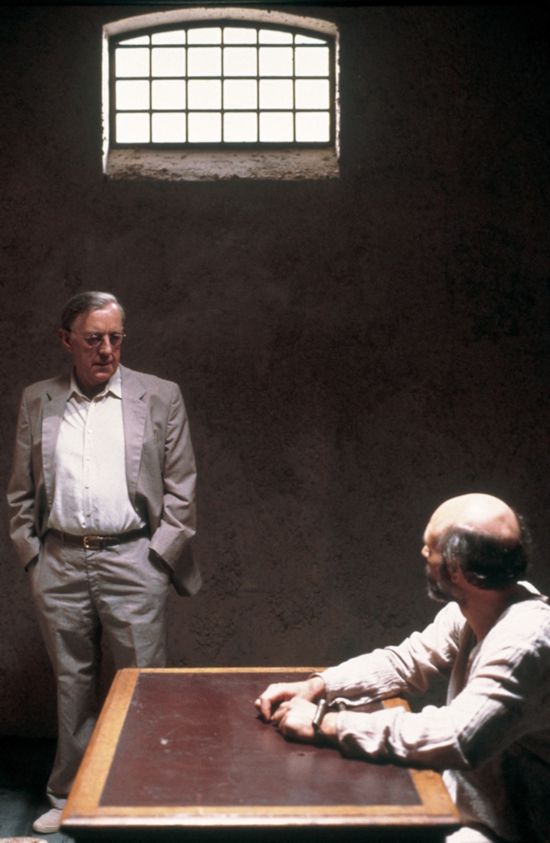 当史迈利向他的年轻门徒彼得·纪兰(Peter Guillam)讲述与卡拉的会面时,他责怪自己当时在印度监狱的那个难忘场景里说太多话了。卡拉通过保持沉默而赢了一局,他把自己变成了一块空白的屏幕,这是史迈利在这种场合里做不到的——这让史迈利更轻易地落入陷阱,因为他总是把自己的焦虑和心事投射到不动声色的卡拉身上。在原著中,他对精神分析术语“投射”假装不屑,但事实上,他没法儿不用这个词去描述自己;确切地说,因为在正常情况下,史迈利的技艺在于营造一种独特的沉默——不是单纯不说话的沉默,而是精神分析家拥有的权威的、钻探式的沉默。面部表情不能出卖任何信息,但同时又必须展现自信。必须让那些不想说话的人吐露真情。在这个日益青少年化、人人喋喋不休的时代,这不就是史迈利在很大程度上吸引我们的地方吗?——他有成年人的气度,使人不禁敬仰,并在不知不觉中诱使我们去征求他的认可。9月份,在电影《锅匠,裁缝,士兵,间谍》面向伦敦评论界公映之后,欧德曼说,把他和吉尼斯扮演的史迈利进行对比的话,没有人想要拥抱他扮演的史迈利。言下之意,好像我们想要拥抱的是吉尼斯扮演的史迈利一样,这其实是无稽之谈。当然,我们发现自己渴望从史迈利那里得到的只是一句话、一个手势、一个最轻微的暗许。但是,如果以为吉尼斯表演出的长辈般的诱惑与欧德曼版本强调的冷酷无情是对立的,那就错了,因为史迈利对猎物无情的、不眨眼的猎杀,依赖的正是这种让人交代出自己的能力。