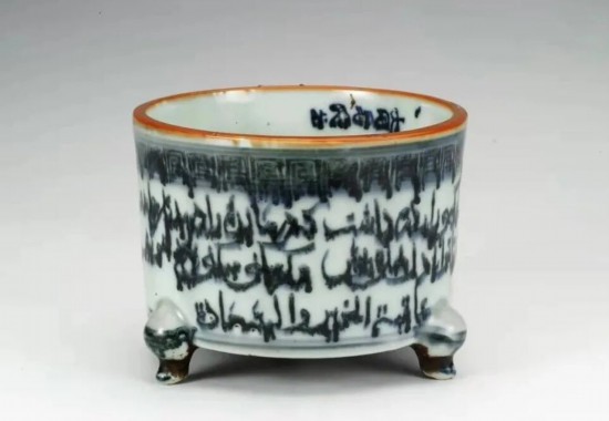 青花波斯文筒式三足炉,外壁书有三段波斯文萨迪《果园》