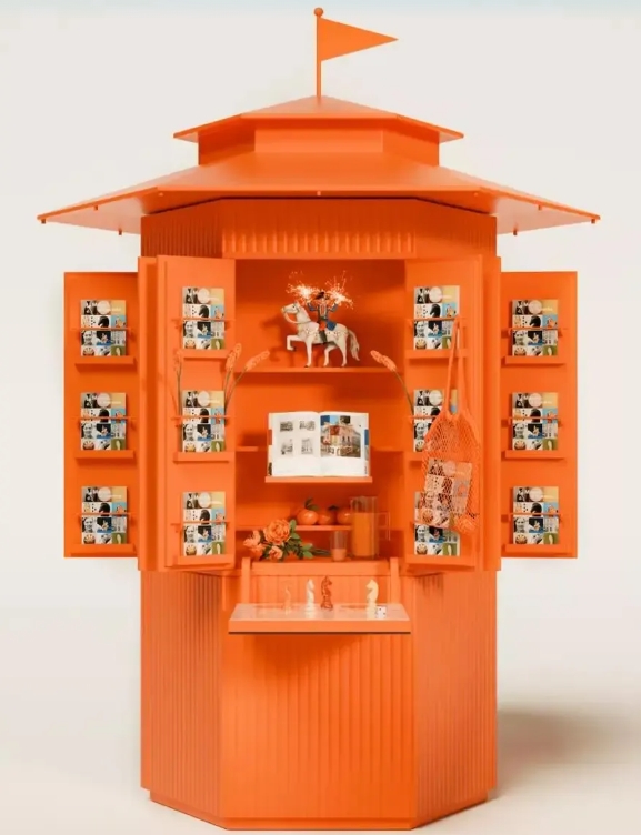 长期以来法国奢侈品牌爱马仕(Hermès)围绕其出版体系与展览项目形成了阅读与观看空间。无论是在巴黎总部、东京或上海的部分展览项目中,爱马仕出版物与文学性文本往往被组织为可供停留与翻阅的空间节点,与其说这些空间是为了“卖书”,不如说它们更像是品牌文化世界的入口:文学在这里成为进入某种生活方式与世界观的媒介。1973 年,这家法国品牌推出《爱马仕世界》[3]杂志。2021 年秋,受到巴黎老式书报亭造型启发,爱马仕在布拉格推出了首个“爱马仕世界报亭”,之后该“报亭”陆续出现在东京、旧金山、伦敦、多伦多、科威特、巴塞罗那……2024年9月“报亭”来到书报亭已经消失的上海,引发大量的公众围观与媒体报道,人们以能有资格造访该报亭感到兴奋;而造访书报亭的公众,可以带着最新一期的《爱马仕世界》杂志和一束鲜花离开[4]。