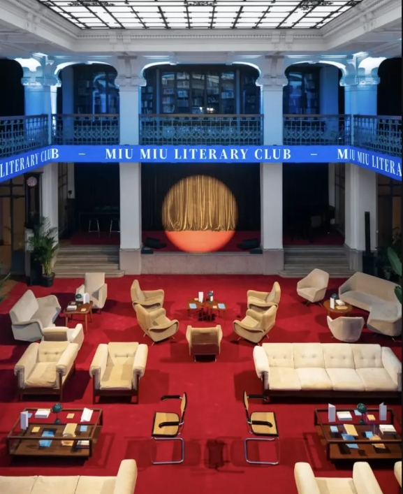 以缪缪文学俱乐部(Miu Miu Literary Club)为例。2024年起,意大利奢侈品牌缪缪(Miu Miu)以“生活书写”为主题,在米兰设计周期间举办首届文学俱乐部活动,选址米兰语文学会[1],由意大利作家奥尔加・坎波弗雷达(Olga Campofreda )担任策展人,在为期两天的活动重读文学作品。第一天,名为“创作空间,创作时间”的对谈围绕阿尔芭・德塞斯佩德斯(Alba De Céspedes)1950 年出版的《秘密笔记》展开,在作家策展人卢・斯托帕德(Lou Stoppard) 的主持下,演员蒂娜・库纳基( Tina Kunakey) 朗读《秘密笔记》章节,普利策奖得主裘帕・拉希里(Jhumpa Lahiri)、斯特雷加奖入围者克劳迪娅・杜拉斯坦蒂(Claudia Durastanti)和导演兼作家希拉・赫蒂(Sheila Heti)等文学工作者就平衡女性身份与创造力问题展开对话。第二天,主题为“我们的天才姐妹”的对谈活动基于 西比利娅・阿莱拉莫(Sibilla Aleramo) 的小说《一个女人》[2]展开。