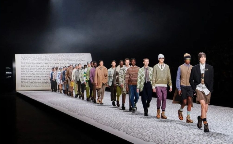 文学作品本身的意象结构与叙事结构,也开始被转译为跨媒介文化装置的组织原则。2022 年,迪奥(Dior) 以杰克·凯鲁亚克的作品《在路上》为灵感,用放大版《在路上》手稿铺就T台。在此,《在路上》手稿被转译为空间叙事的结构元素:叙事精神与体验逻辑渗透于空间路径、视觉图像与观看行为之中。在 Dior 2023 年冬季男装系列中,时任男装艺术总监 金・琼斯(Kim Jones) 通过明星罗伯特·帕丁森(Robert Pattinson) 与 格温多兰・克里斯蒂(Gwendoline Christie) 对T.S. 艾略特(T.S. Eliot)《荒原》诗句的朗读,将这一现代主义经典作为一种象征资源,嵌入整体秀场的声音装置与氛围结构之中——《荒原》被拆解为可被调用的意象与语义碎片,用以支撑整个秀场关于现代性废墟与精神荒芜的主题叙事。Dior 2025 年秋冬女装设计总监玛丽亚・格拉齐亚・基乌里(Maria Grazia Chiuri) 与戏剧导演、舞台设计师 罗伯特・威尔逊(Robert Wilson )以弗吉尼亚·伍尔夫《奥兰多》为蓝本所构建的舞台叙事,则展示了文学策展化的更深层形态。在成衣秀中,《奥兰多》中关于时间跨越、身份流动与性别变形的叙事结构,被整体转译为舞台调度、空间节奏与视觉叙事的组织原则。文学文本在此被转译为一种情绪与氛围的发生器,其功能从“文学作品”转向“策展母题资源”。