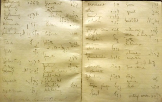 红褐色油布记事本,淡蓝色封面,内有二十页(除了最后一张,其余纸张都已脱离书脊),淡黄色页面,无横线,圆角;长24.85厘米,宽19.8-20.0厘米;两组分别为两张和十八张(原本都是二十张);线装本(有两处订印);红色图案;水印类型2a和3a;第19页和第20页为空白。纸页已脱落。