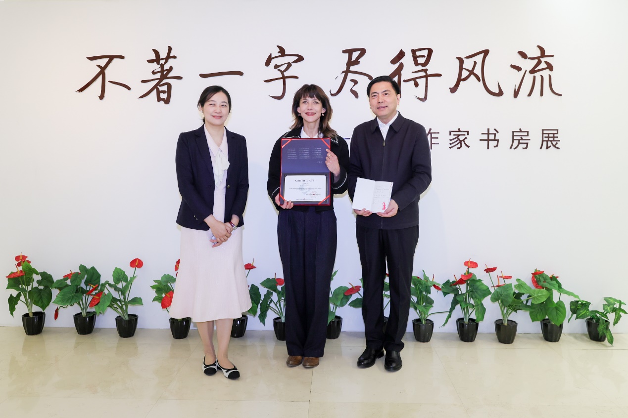 发布会前,苏菲·玛索参观了中国现代文学馆作家书房展以及中法交流珍品陈列,并向中国现代文学馆捐赠签名著作,中国现代文学馆常务副馆长王军接受捐赠。