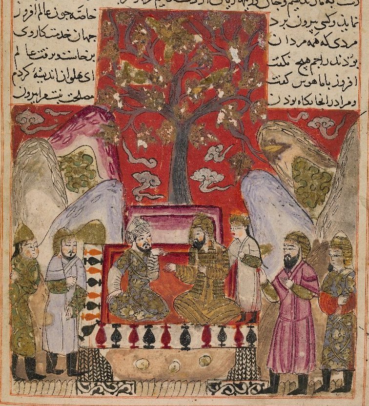 而在视觉艺术方面,博德利安手稿中的80幅插图更是价值极高。这些插图属于典型的“因朱风格”,与大不里士的“伊利汗国风格”既有联系又有区别。因朱风格的绘画线条更加柔和,色彩更加明快(常用青金石蓝、朱砂红),人物造型略显圆润,面部表情丰富,背景装饰繁复而精致,常伴有独特的建筑样式和植物纹样。