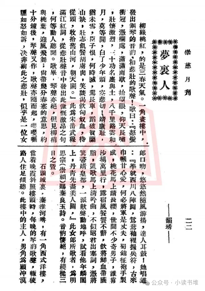 韻琇:《梦里人》,《崇慈月刊》1932年6月第3期